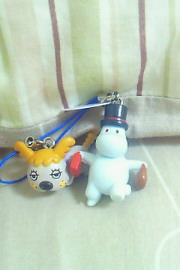 写真はさくらんぼと、一緒に行った先輩と同輩がくれたキーホルダー…というかストラップ(買ったペットボトルのおまけだったらしい)。ムーミンパパとぜんまいざむらいのキャラ。